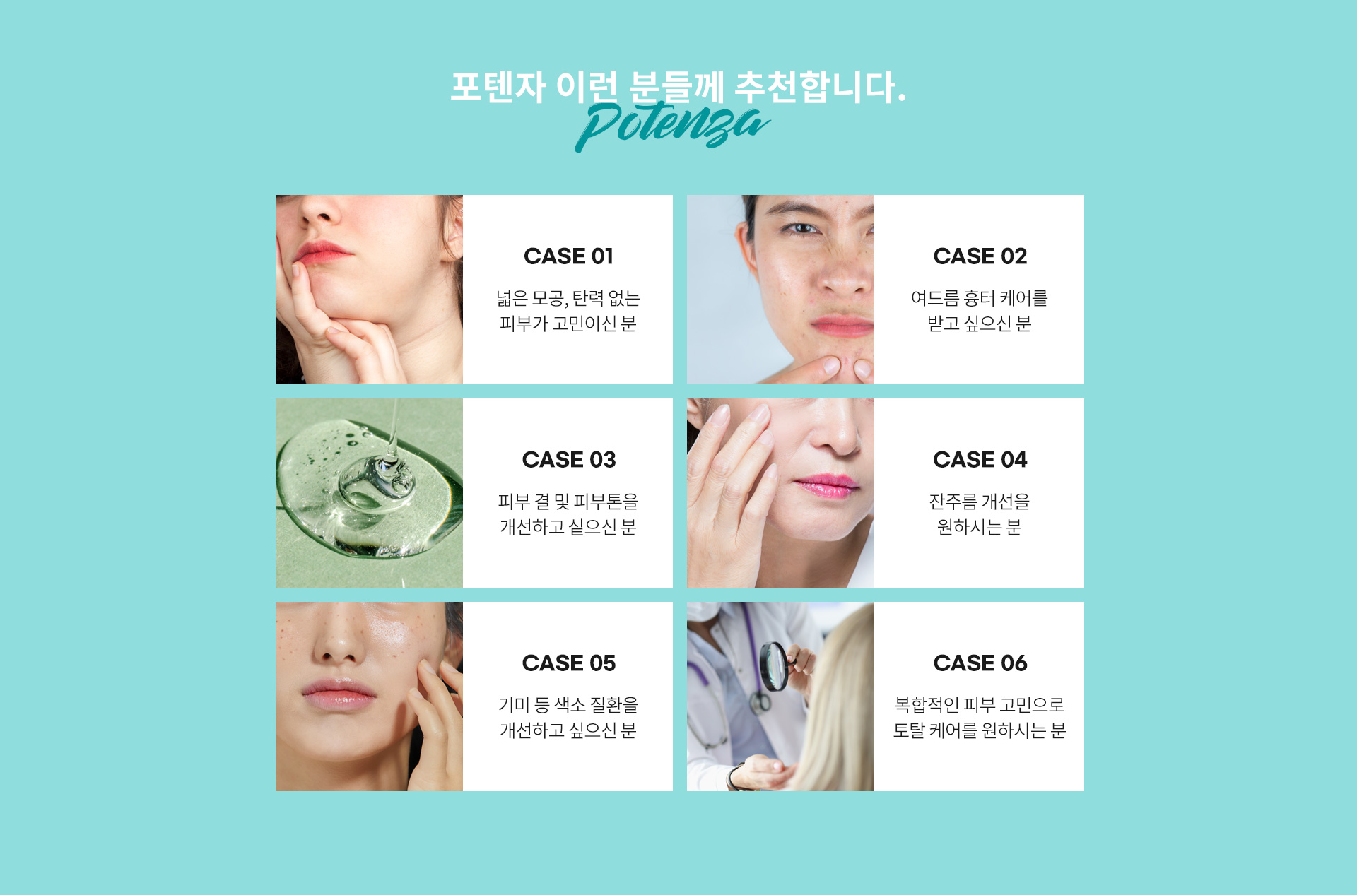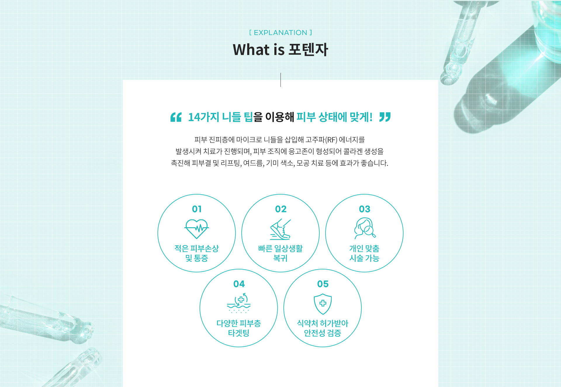 포텐자는 피부 진피층에 고주파 에너지를 발생시켜 콜라겐 생성 및 리프팅, 여드름, 기미 색소, 모공 치료 등에 효과가 좋은 시술입니다.